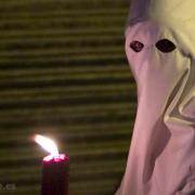 Los miembros de la hermandad que componen el cortejo pocesional portando cirios o insignias, vestidos con túnicas y cubiertos por el capirote y el antifaz. - Costaleros