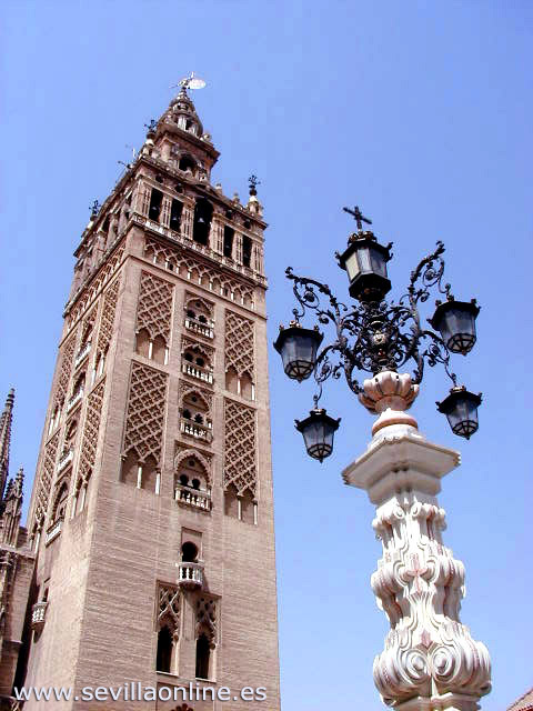 La Giralda es el monumento emblemático de Sevilla. Este minarete de estilo Almohade fue construido por los Moros entre 1184 y 1197 hasta una altura de 76 metros. El minarete de la antigua mezquita estaba coronado por tres bolas doradas que desaparecieron en el siglo XIV debido a un terremoto. En 1586, después de la reconquista, los cristianos añadieron el campanario, alcanzando una altura de casi 100 metros. En 1987 fue declarado Patrimonio de la Humanidad por la UNESCO junto con la Catedral de Sevilla, los Reales Alcázares y los Archivos de Indias.