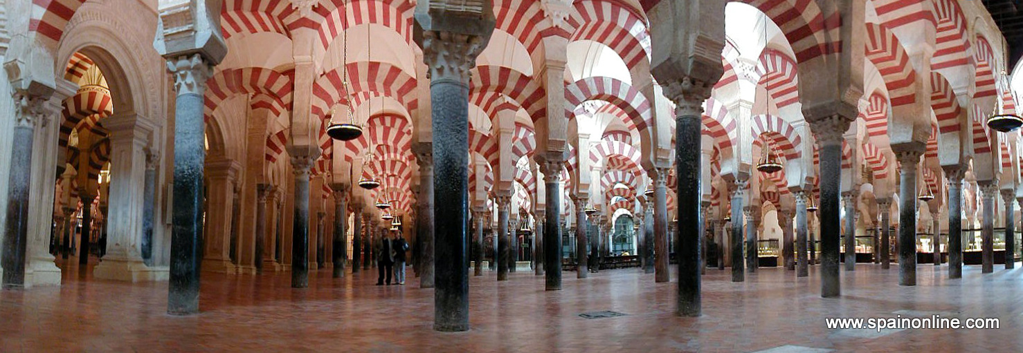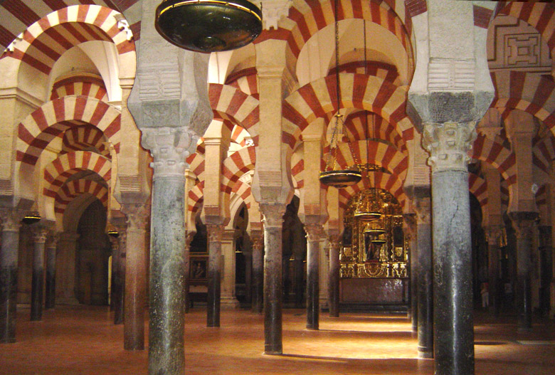 La Mezquita di Cordova è senza dubbio un’opera maestra dell’arte musulmana. Osservi prima di tutto il Cortile degli Aranci, con varie fontane e il pozzo d’Almanzor del secolo X. Entrando ci si sentirà immersi in un vero bosco di colonne e archi in cui il colore e le ombre giocano un ruolo importante.